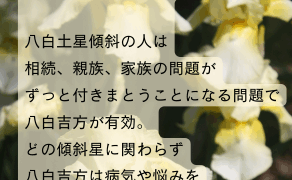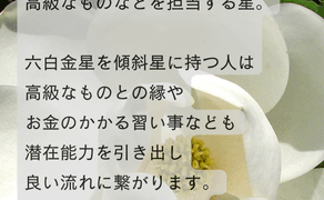 一白水星は人間関係を担当する星。身近な人間関係といえば家庭内。傾斜星が一白水星の人は家庭内の問題が...