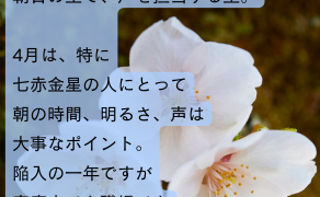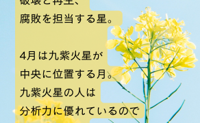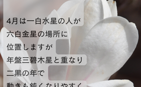 六白金星は完成を担当する星。4月は一白水星の人が六白金星の場所に位置しますが年盤三碧木星と重なり二...