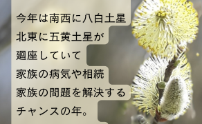 八白土星は家族を担当する星。今年は南西に八白土星北東に五黄土星が廻座していて家族の病気や相続家族の...